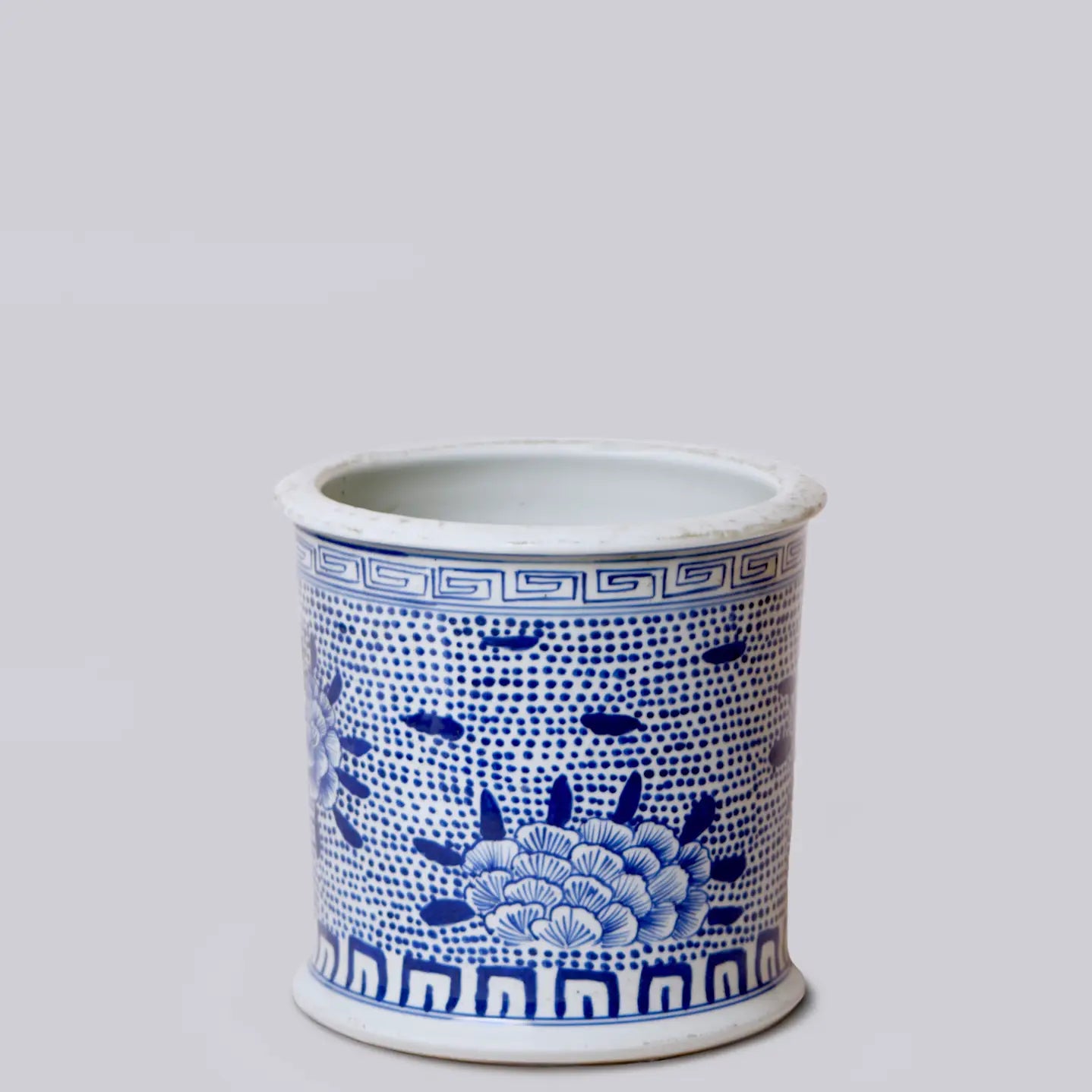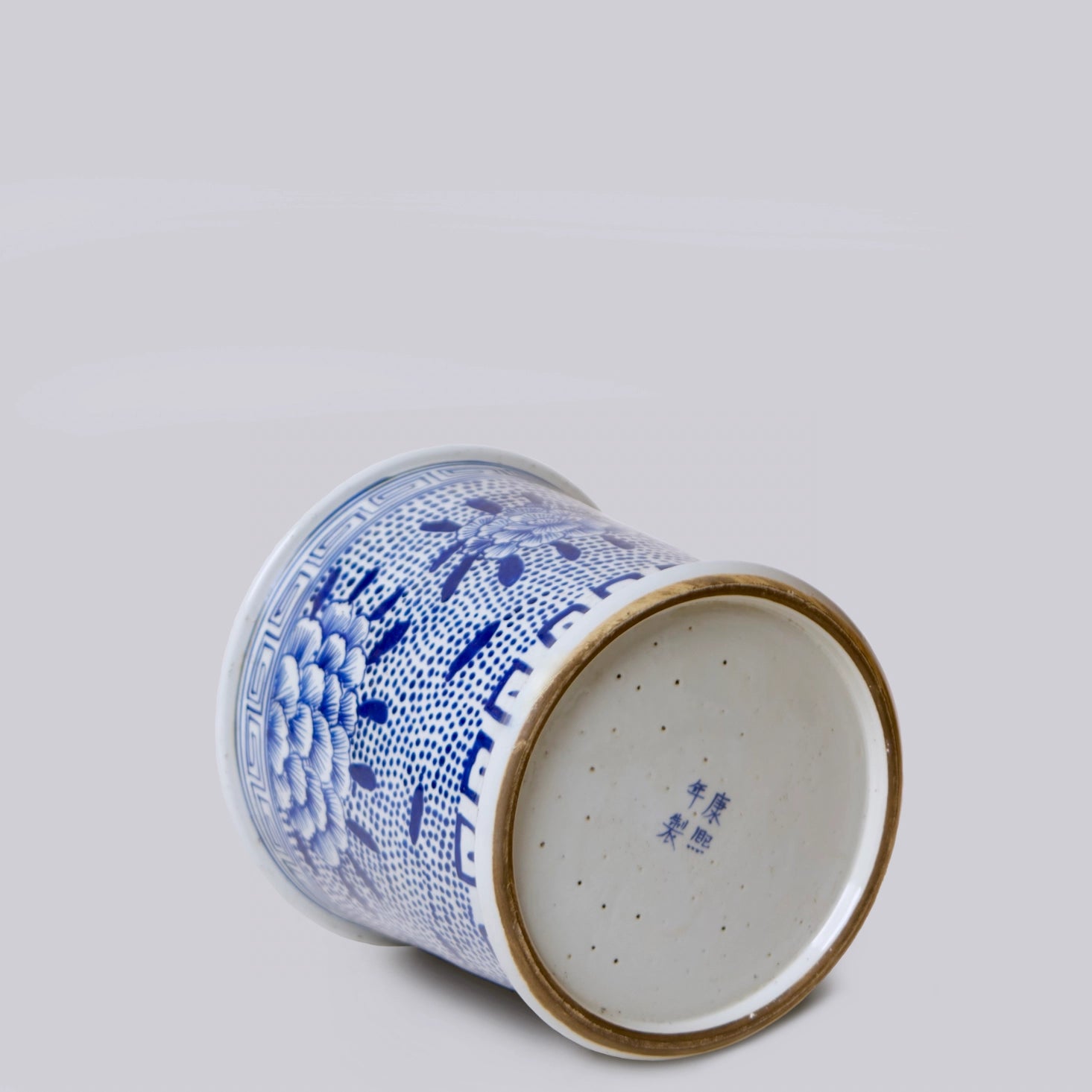 A beautiful porcelain cachepot with a peony design. Measures 9 1/2" high by 9 1/2" wide.