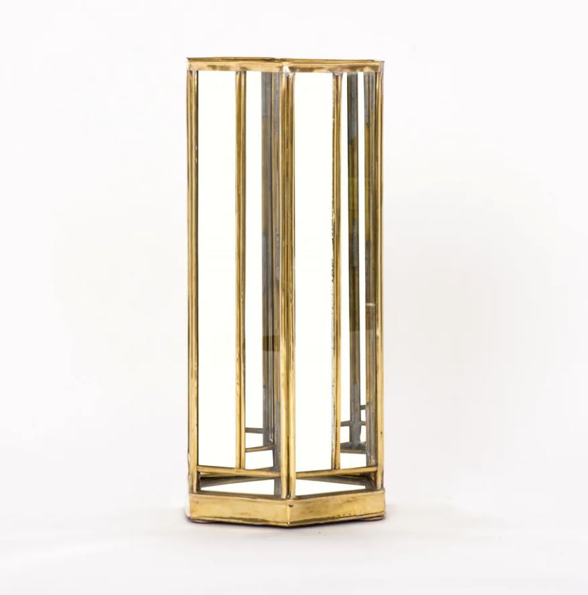 Six-Sided Brass Candle Lantern with Glass and Antiqued Mirrored Glass Panes.