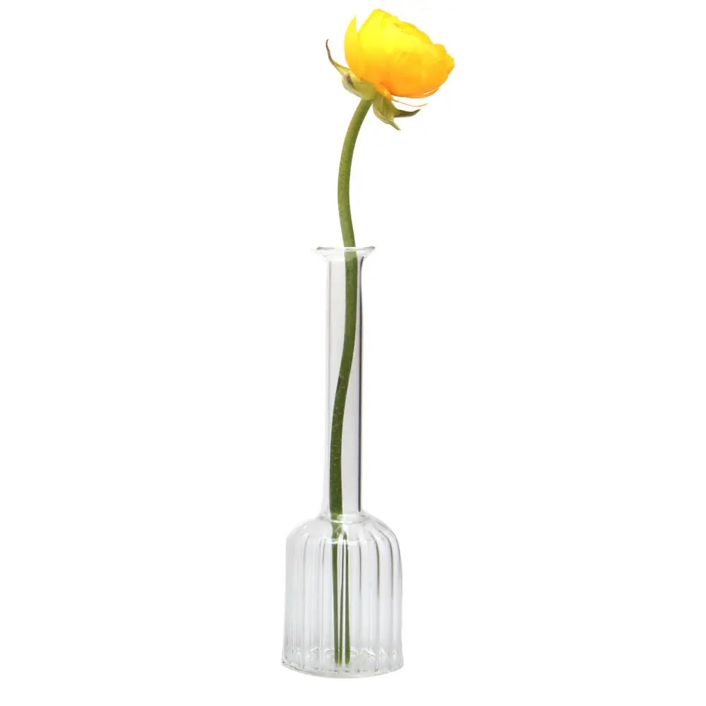 A narrow necked clear glass bud vase with a ribbed design. Measures 6 inches high.